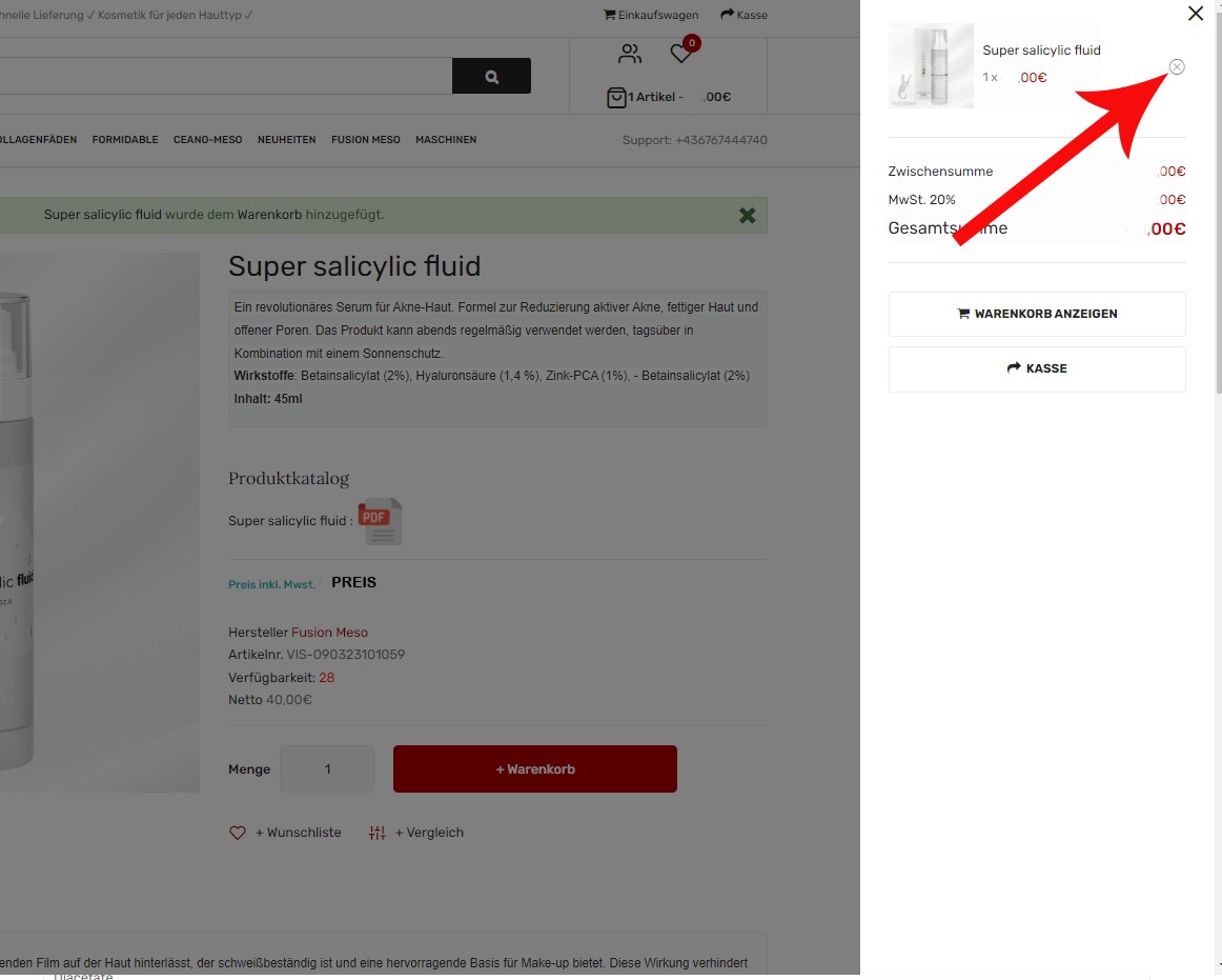 Wenn Sie weitere Produkte bestellen möchten, schließen Sie das Fenster, indem Sie auf das Kreuz neben dem Produkt auf der rechten Seite oder in der Mitte Ihres Fensters klicken. Wenn Sie keine weiteren Produkte wünschen, gehen Sie zur Kasse oder zum Warenkorb anzeigen.